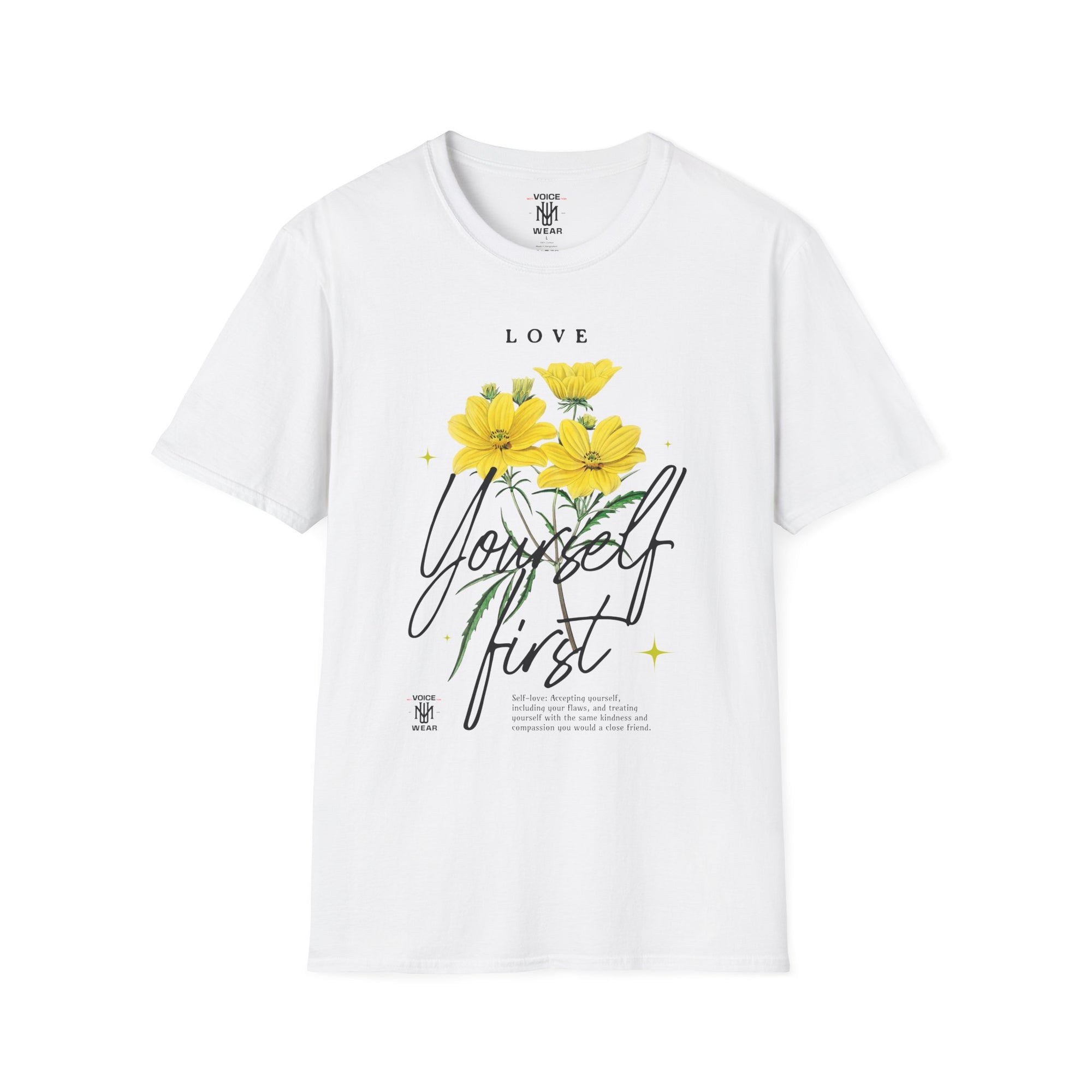 This J Thomas Design/"moti-Voice-tion Wear", "Love Yourself First" phrase is printed on our Gildan 64000 Unisex Softstyle T-Shirt. They're made using ethically grown 100% ring-spun cotton, certified by Oeko-Tex for safety and quality assurance, and offer a blend of comfort and durability, making it ideal for custom apparel. The soft feel of the Gildan 64000 is due to the ring-spun cotton, which provides a gentle touch while maintaining robustness through regular wear and washing.